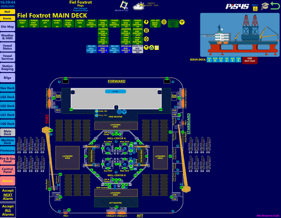 The model delivers simulation of dynamic positioning, dual well centre drilling operations, integrated marine and drilling power management, Fire & Gas systems, helideck monitoring, and structured ESD logic—enabling customers to extend scenario-based emergency response, command decision-making, and systems management training into the complex deepwater drilling environment while maintaining the consistent architecture and realism of the Pisys OTS platform.